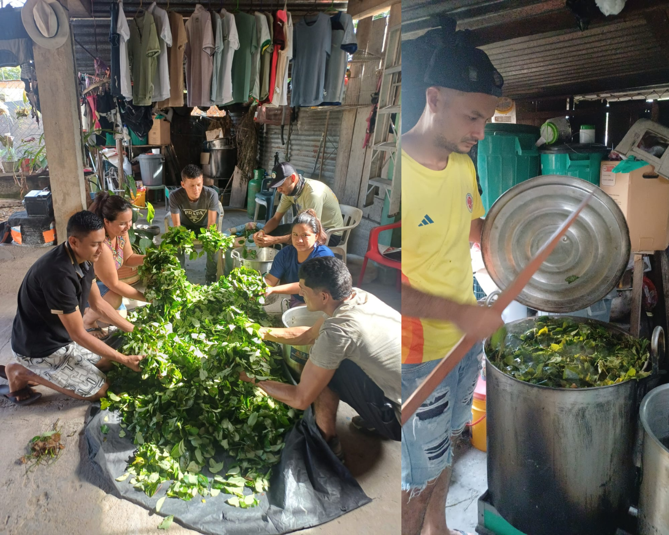 The group, made up of approximately twelve young people and women from the Miraflor community, is actively working on this project and is preparing various designs and prints on t-shirts and other garments to present at an upcoming event. “We’re adding color to everything,” says Johana Arcos, who seeks to start her own business and support new generations through this initiative. The project aims to raise awareness among community members who still work with coca, showing them that the plant has multiple uses beyond those already known. It can be used medicinally, but it can also be used to make dyes, oils, and watercolor pigments for both dyeing garments and painting designs on them. The entire process is artisanal, natural, and organic, and the intention is to share it with more people to invite them to explore the diverse uses this plant can offer.